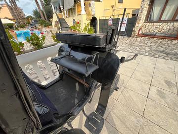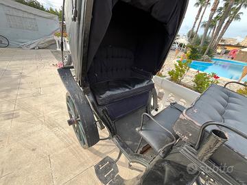 Carrozza in legno con ruote in legno tutta originale . Prima verniciatura originale. Cappotta mantice in pelle . Cuscinetta in pelle . Utile per misura per cavallo da 130cm . Per info non esitate a contattarmi