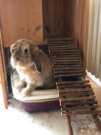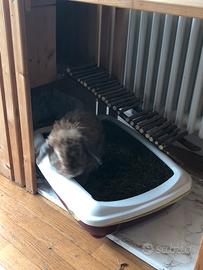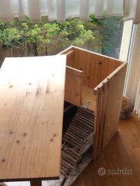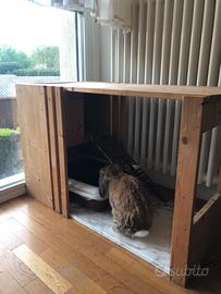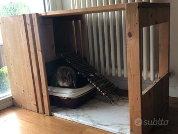 Vendo mobile/Casa per coniglio fatta in casa. In legno di pino naturale La base io l'ho rivestita con un adesivo plastificato (effetto marmo, si può cambiare) per renderla impermeabile nell'eventualità che acqua si dovesse rovesciare o che il coniglio dovesse far pipì, fuori dalla cassetta. sicuramente richiede un po' di manutenzione perchè solo con lo smontaggio del mobile si è necessariamente dovuta togliere una parte di adesivo molto comoda, fatta Secondo le necessità di un coniglio, Completamente aperta quindi non è una gabbia, con la parte inferiore in cui si riesce a inserire la cassetta per i bisogni E un piccolo spazio superiore per rifugiarsi raggiungibile tramite una scaletta di legno di nocciolo naturale. La scaletta si Può alzare e permette di togliere la cassetta con facilità per fare le pulizie. Il coperchio del mobile è anch'esso amovibile così da poter pulire la parte superiore comodamente. Noi l'abbiamo usata per tanti anni e ha qualche segno di usura (e qualche smangiucchiamento da parte di coniglio) Ma è in buone condizioni E comodissima e non la venderei se non fosse che nella nuova casa non mi serve.
