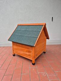 In pino verniciato, tetto rivestito in carta catramata con piedini antiscivolo per proteggere dall'umidità e dal freddo del suolo e per permettere un buon ricircolo d'aria.