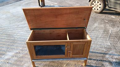 Vendo casetta in legno per coniglio nano, con tetto apribile, cassetto estraibile, e due porte anteriori apribili per i due vani.