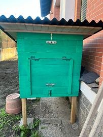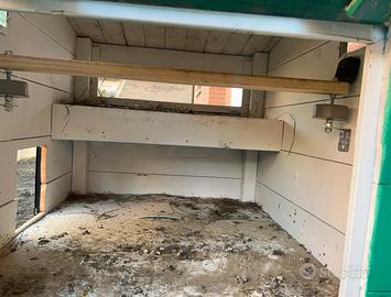 Artigianale in legno massetto di pino, usata 2 settimane e poi ho venduto le galline perche erano troppo rumorose, peccato. Portellone grande per pulizia, portello per raccolta uova, portello con rete per preda aria e 2 finestre per la luce. La porta automatica non ce piu, l’ho venduta separatamente