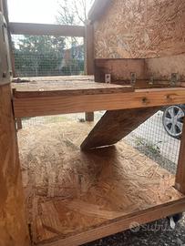 Casetta in legno su due piani , con ruote e tetto apribile a metà ( nella foto il tetto è aperto, è presente anche il pezzo per chiuderlo). All’interno per andare da un piano all’altro c’è la scaletta / scivolo.
