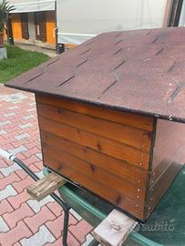 Casetta per cani in legno trattata con impregnante, sotto base in alluminio e tetto con tegole canadesi Larghezza 60 cm Profondità 61 cm Altezza 69 cm Misura porta ingresso 44 cm x 17 cm