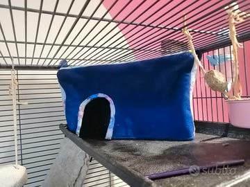 Bellissima casetta sospesa in pile fatto a mano per cincillà, ratti, cavie...con relativo tappetino assorbente. Ottima manifattura e tessuti. L'ingresso si può fare anche con le frange se si preferisce più aperta. Tessuti e misure si possono scegliere e possiamo creare set bellissimi aggiungendo amache, tunnel e quant'altro. Sul mio profilo trovate tanti altri articoli che realizziamo per i nostri piccoli animaletti. Prezzo della casetta 30x30 x40 h 25 cm con tappeto 25 euro. Possibilità di ritiro zona Milano.