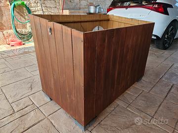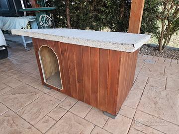 Vendo casetta per cani di taglia medio-grande da esterno. Misure 80cm x 123cm (tettoia), 60cm x 104cm (casetta), altezza max 80cm. La tettoia e il pavimento della casetta si possono rimuovere per facilitare la pulizia (vedi foto). La casetta è in legno, i piedini d'appoggio in plastica. La casetta é stata ristrutturata perché si era rovinata stando fuori alle intemperie: la tettoia è stata rifatta usando un pannello in multistrato e guaina, è stato dato dell'impregnante protettivo sul legno esterno. Preferibile ritiro a mano.