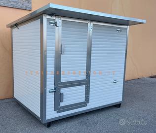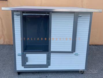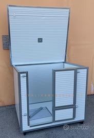 Cassa parto realizzata completamente con pannelli sandwich isolanti e igenizzanti, completamente bordata anti morso, porte sdoppiabili per un uso completo dalla nascita del cucciolo allo svezzamento, rendendo cosi il cucciolo indipendente nell’entrare e uscire da solo senza problemi. Apribile anche il tetto per la miglior gestione della pulizia interna. Possibile inserire all’interno l’anti schiacciamento salva cuccioli. Gancio supporto lampada sul tetto.