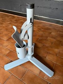 Poggiapiedi in alluminio e in ferro di qualità e verniciato con una tonalità di grigio “professional”. Dotato di porta attrezzi rotante. Base d’appoggio a tre piedi altezza fissa. Garantisce un comfort ottimale per il cavallo grazie al cappuccio superiore in gomma per l’appoggio dei piedi. Questo cavalletto è inoltre dotato di un pratico e comodo sistema d’appoggio per il piede posteriore completamente integrato.