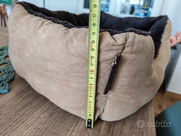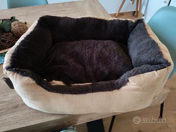 Cesta o cuccia per cani di piccola taglia o per gatti usata solo due volte per ospite avuto in casa x pochi giorni. Nelle foto potete vedere le dimensioni. Cuscino rimovibile per usarla anche in estate e per lavarlo più facilmente.