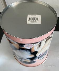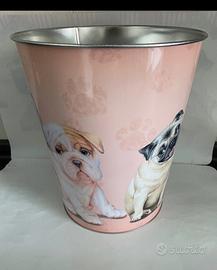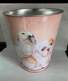 Cestino porta oggetti (carte, giochi, rifiuti, ecc.), nuovo senza cartellino, materiale in metallo, mai usato. Misure diametro 22 cm, altezza 25 cm.