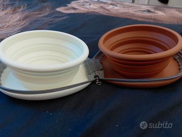 In silicone quindi antiurto, mai usato, estremamente comodo perché compatto pur avendo 2 ciotole con diametro di oltre 12 cm...riesce quasi a stare in una tasca.