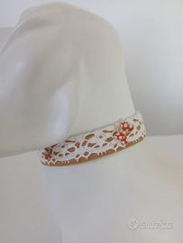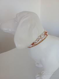 Collana Per Cane in puro cotone giallo senape, decorata con pizzo e charms, chiusura con bottone a pressione. Circonferenza da 30, 34 e 38 cm