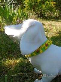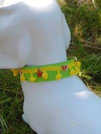 Allegro collare in puro cotone colore verde pistacchio, con pom pom e charms. Chiusura con fibbia oro. Misura da 34 a 40 cm.