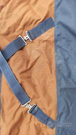 Coperta invernale imbottita lunga (con copri coda e copri collo). Grammatura 400, misura 145 cm, blu e marrone. Ben tenuta, senza strappi e comprensiva di tutte le cinghie regolarmente funzionanti.