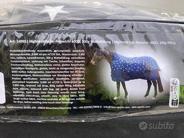 Coperta da paddock HKM con nuca, impermeabile, 600D, imbottitura 300g, cinghe incrociate sottopancia, cinghie in metallo sul petto, cinghe sottocoscia elastiche, ampio paracoda. Blu con stelle bianche. Comprata da Selleria la Colombaia a ottobre 2025 (pagata 95 euro), usata solo per un paio di mesi in inverno, lavata tramite Decathlon (ancora nella busta della lavanderia). Con borsa originale. La coperta è in ottimo stato, praticamente nuova. È ancora nella busta della lavanderia, se interessati la apro e controllo eventuali difetti. Purtroppo non mi serve più dato che la mia cavalla è mancata recentemente all'età di 32 anni! Consegna a mano anche a Trento e dintorni, lungo la A22 in direzione Modena, zona Reggio Emilia, Parma e Ferrara.