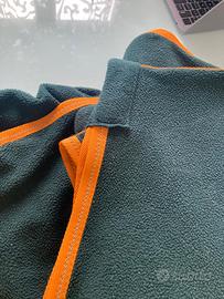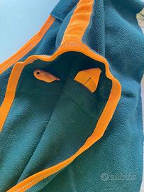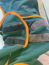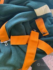 Coperta in pile HKM, cinghe incrociate sottopancia, anelli per sottocoda, velcro anteriore, striscia riflettente sul posteriore. Verde scuro e arancione. Misura 135 cm. Comprata a Fieracavalli a ottobre 2024 (prezzo 35 euro), usata solo per un qualche settimana in inverno sotto alla coperta pesante, lavata in lavatrice un paio di volte. La coperta è stata modificata da una sarta. In particolare, le cinghie sottopancia in origine erano rimovibili con inserti in velcro e troppo lunghe per la mia cavalla, mentre sul petto c'erano degli inserti in metallo. Gli inserti sono stati rimossi, le cinghie accorciate e fissate con cuciture, e il velcro usato per la chiusura sul petto. Vi posso dare tutte le misure se siete interessati. Purtroppo non mi serve più dato che la mia cavalla è mancata recentemente all'età di 32 anni! Consegna a mano anche a Trento e dintorni, lungo la A22 in direzione Modena, zona Reggio Emilia, Parma e Ferrara.