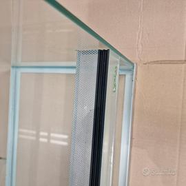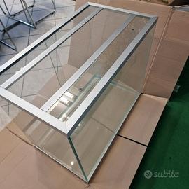 Terrario tecnologico con profili in alluminio anodizzato, griglie di aerazione e vetri scorrevoli.