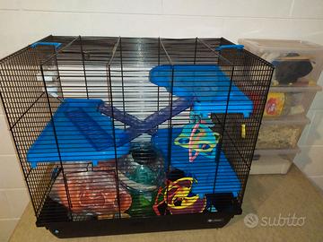 gabbia su 3 livelli, accessori gabbia, canapa per 3 anni minimo (200 litri), labirinto gioco, trasportino, mangime, giochi. tubi, ruote....etc.