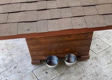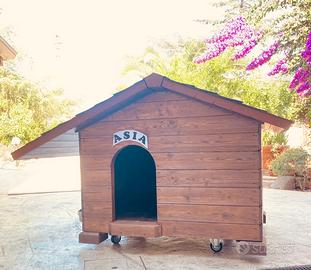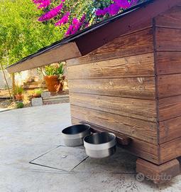 Cuccia chalet realizzata artigianalmente avente dimensioni interne 103x134cm e h min. 75cm e h max 105cm. Legno abete.