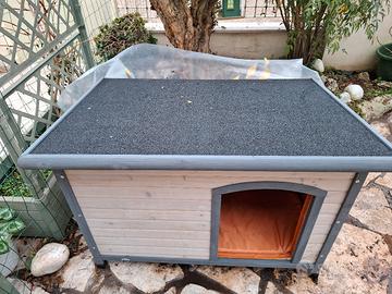 cuccia cane in legno da esterno con tetto impermeabile apribile completa di rivestimento interno per isolamento invernale. si vende montata no spedizione ritiro presso la mia abitazione.misure larghezza 116 profondita 70 altezza 82
