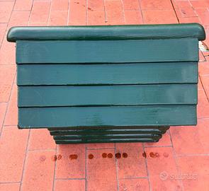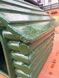 Cuccia per cani taglia media in plastica, stile casetta, colore verde. Struttura solida e resistente, adatta per uso esterno. Presenta lievi segni di usura/rovinature come visibili in foto, che non compromettono la funzionalità. Ideale per offrire riparo e comfort al cane.