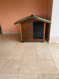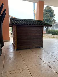 Cuccia pari al nuovo, tutta in legno trattato per esterno, pareti doppie e coibentate con materiale isolante, tetto in resina ondulata impermeabile, adatta a cani grossa taglia tipo cane corso, san bernardo e simili. Misure: TETTO lati cm 170x154, altezza esterna cm 130 al vertice e 110 ai lati, altezza interna cm 102 al vertice e cm 84 ai lati.