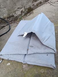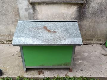 cuccia robusta in lamiera con pannelli in plastica. dimensioni, compreso tetto, larg.71 x lunghezza 88 x altezza 76. ingresso 37x25. presenta un po' di ruggine sui piedini, ma sembra solo superficiale. compreso anche materassino interno