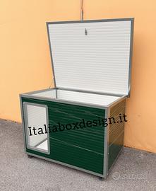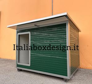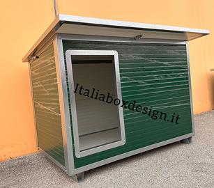 Cuccia per il cane con pannelli sandwich colorazione verde/grigio. I pannelli in coibentato hanno uno spessore di poliuretano espanso ad alta densità di 30mm. La cuccia viene bordata tutta con profili anti morso quindi indistruttibile. Apribile per la pulizia interna, lavabile e disinfettabile in ogni sua parte, con qualsiasi prodotto casalingo. Piedini anti sfondamento in acciaio inox tendina in pvc applicabile.