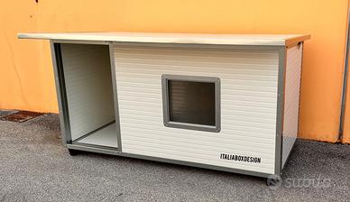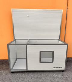 Cuccia coibentata con il pre ingresso, rialzata da terra con piedini in acciaio inox anti sfondamento, in questa soluzione la zona notte è ben protetta dalle intemperie e il cane sta bello caldo d’inverno e fresco d’estate. Apribile dal tetto per la pulizia interna. Blocco del tetto sia in apertura che i chiusura. Lavabile e sanificabile con qualsiasi prodotto. Cuccia nuova, ed è possibile la spedizione. Possibile agganciare la tendina in pvc atossico nella porticina per una maggiore protezione dell’aria.