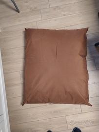 È una cuccia-cuscino marrone abbastanza spaziosa, comprende la cuccia più due cuscini, uno marrone originariamente parte della cuccia e uno extra blu e verde.