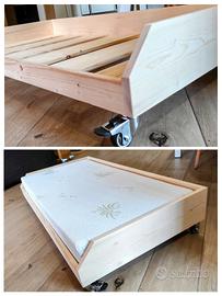 Cuccia divanetto lettino per animali domestici, realizzazione artigianale in legno massello, dotata di ruote con freno.