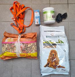 Assieme alla cuccia sono incluse due ciotole in alluminio, crocchette, guinzaglio con pettorina, 1 rotolo di sacchetti igienici, due prodotti per pulizia denti.
