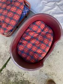 Praticamente nuova mai usata invecchiata sullo scaffale. Completa di piedini che la tengono sollevata dal pavimento e due cuscini anche loro come nuovi solo invecchiati. Misure della cuccia utilizzabili dal cagnolino o cagnolina cm.43x28.