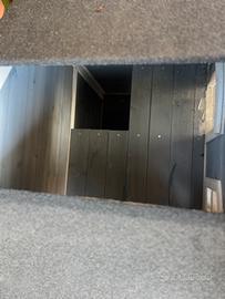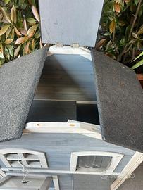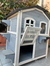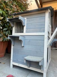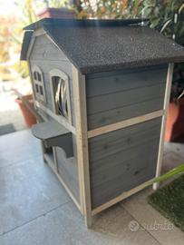 Villa per Gatti lionto – Casetta in Legno a 2 Piani (Interno/Esterno) Regala ai tuoi felini un vero castello! Vendo splendida casetta per gatti della marca lionto, un modello a due piani spazioso e rifinito, ideale per chi cerca un rifugio sicuro, caldo e divertente per i propri amici a quattro zampe. La struttura è pensata sia per l'uso interno che esterno, grazie ai materiali resistenti agli agenti atmosferici. Caratteristiche Principali e Dettagli Tecnici: • Marca: lionto (modello "Villa"). • Dimensioni: 80 x 55 x 90 cm – Dimensioni generose, adatte anche a gatti di taglia grande o per far convivere comodamente due gatti. • Materiale Pregiato: Realizzata in legno di abete di alta qualità, naturale e accogliente. • Tetto Protettivo: Tetto spiovente rivestito in bitume isolante, perfetto per riparare dalla pioggia e dal sole se posizionata in giardino, balcone o veranda. • Design a 2 Piani: I gatti adorano stare in alto! La villa si sviluppa su due livelli collegati da pratici scalini laterali esterni che permettono al gatto di salire e scendere facilmente. • Comfort e Accessi: * Dotata di finestra con protezione e una tenda a lamelle trasparenti sulla porta principale per mantenere il calore all'interno senza impedire il passaggio. • Porticina frontale trasparente che permette al gatto di osservare l'esterno sentendosi protetto. • Estetica: Elegante colorazione Grigio e Bianco, che si adatta perfettamente a qualsiasi arredamento o spazio esterno moderno.