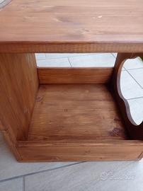 Bellissima cuccia in legno massello listellare a tre strati d qualità superiore, poi verniciato con impregnante ad acqua color noce x preservare il prodotto anche x uso esterno, compreso nel prezzo anche cuscino in cotone.Tutto con la qualità di marca " Cose da gatto " e in ottime condizioni.
