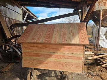 vendo cuccia cane taglia grande 130 lunga 80 larga 80 altezza, legno di castagno e abete, 3 cm di grossezza, fatta da me, nelle immagini va ancora verniciata e rifinita, proprio per poterla personalizzare a proprio gusto e piacere. volendo si può fare anche in altre misure, senza problemi.