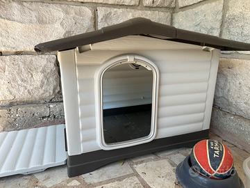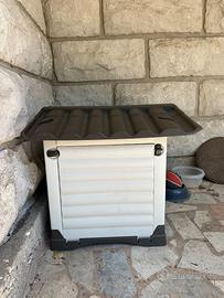 Vendo cuccia per cani di piccola taglia, comprata usata ma il mio cane non ci sta ed è piccola per lui Misure: Larghezza 63 cm H 53 cm Profondità 43 cm Porta avanti 20x30 cm Porta laterale chiudibile 34x32 cm LAVATA