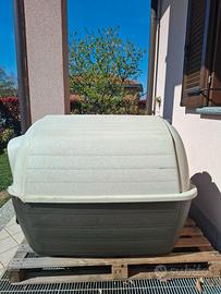 Cuccia da esterno per cani in resina termoplastica resistente urti e raggi UV, con griglia di areazione e sistema di drenaggio. Smontabile. Misure 80 × 116 × 80.