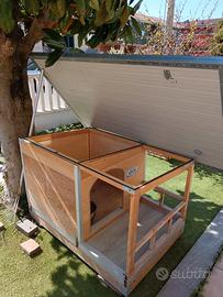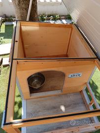 Vendo per completo inutilizzo da parte del mio Golden cuccia per cani medio grandi, costruita 2 anni fà, tutta in legno pavimento e pareti coibentate così come il tetto. Completamente apribile sia il tetto che la parte sotto per la pulizia. Dimensioni totali di ingombro150x100 circa. Possibilità di consegna nelle vicinanze. prezzo 100 trattabili. Claudio