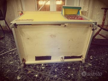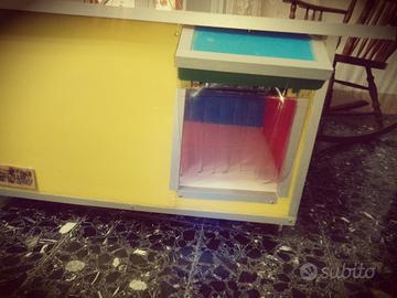 Completamente fatta a mano 70% legno 20%PLastica 10%materiali misti alluminio polistirolo paglia e viti esterne in acciaio inox •Tettto: interamente bordato sia ai laterali sia intorno al vetro opaco, siliconato per infiltrazione d acqua e completamente isolato •Pareti: lunghe a doppio strato con all interno Paglia per isolare la cuccia dal freddo e dall' umidità, pareti corte con polistirolo per lo stesso motivo •Angoli interamente bordato in alluminio con viti ii acciaio inox quindi antiruggine, le parti più esposte sono tutte antiruggine Fondo: Multistrato da 20 mm foderato con morbida spugna da 15 mm e tappezzato con vin pelle beige •Illuminazione: all interno troverete una piccola lampadina a led multicolore con telecomando sotto il vetro con attacco T10 che potrà essere sostituita con qualsivoglia lampadina sempre con attacco T10 la luce è facilmente controllabile con il telecomando tramite il vetro opaco da 6 mm posto sul tetto Facilmente trasportabile con ruote due fisse e due girevoli con freno •Antimorso perché bordata in alluminio anche l entrata con tendina in materiale trasparente per favorire la non fuoriuscita del calore •Misure : 80 lunghezza 50 profondità 40 altezza