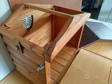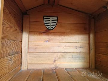 cuccia per cani di piccola taglia, realizzata con legno di pino nordico trattato per resistere alle intemperie, tetto spiovente e amovibile per facilitare la pulizia, parete anteriore apribile, presa d'aria posteriore per ricircolo aria, tenuto sempre al coperto pari al nuovo, misure di ingombro massimo (tetto) L 79 x P 57 x H 65