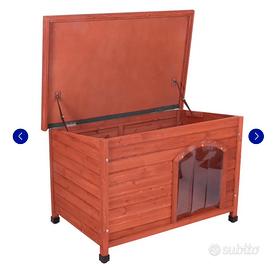 Vendo cuccia per cani di taglia grande in legno, con tetto apribile, mai utilizzata, solamente montata e smontata e rimessa nella scatola. Presenta un piccolo difetto non causato da me in una asse di legno