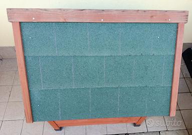 Cuccia per cani di media e piccola taglia. Ottima anche per gatti. Da esterno ma utilizzabile anche per interno. Porta a lamelle di plastica che protegge da aria e umidità. Realizzata in legno di cipresso di Cunningham trattato con sostanzaatossica per proteggere la struttura dagli agenti atmosferici.i i larghi spioventi del tetto sono realizzati in bitumato verde. Dotato di un tappetino isolante sul fondo della cuccia per ripararla dall'umidità. Dimensioni: L76 x P72 x H76 cm. No spedizione solo ritiro.