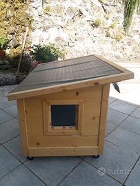 Vendo cuccia per gatto o cane di piccola taglia autocostruita in perline e assi di abete trattati con impregnante, con pannelli interni per isolamento termico, su rotelle. Il tetto è sollevabile ed è protetto da un foglio di pvc. Dimensioni: larghezza 99cm, profondità 66cm, altezza max 66cm/min 55cm.