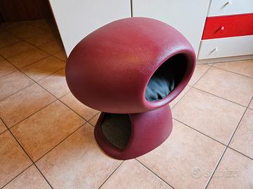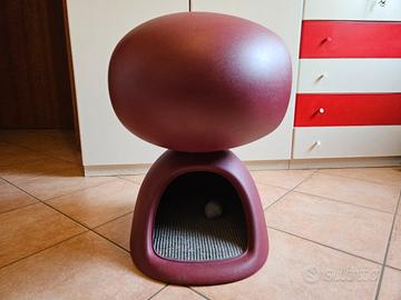 Cuccia di design, per gatti. Modello Qeeboo Cat Cave. Design by Stefano Giovannoni. Nuovo, mai utilizzato. Rappresenta due pietre sovrapposte, colore Bordeaux. In polietilene. Al "piano inferiore" è presente un tappetino tiragraffi, una morbida pallina scende dal "soffitto". Al "piano superiore" un comodo cuscino.
