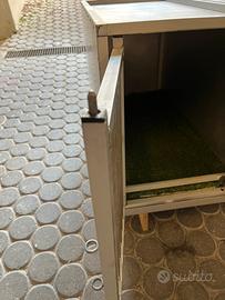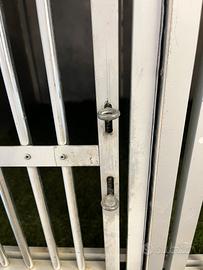Cuccia trasportino da auto composta da tre separati compartimenti. Completamente in alluminio quindi molto leggera. Le dimensioni sono state progettate per essere inserita perfettamente in un Terrano. Le due cuccie esterne sono larghe 43 cm, alte 53, e profonde 84 cm; mentre quella centrale ha stesse misure salvo la larghezza che è 43 cm.