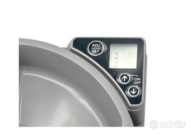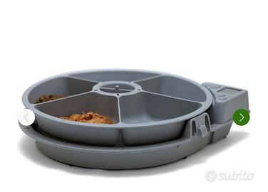 Distributore NUOVISSIMO (con scatola originale) automatico per gatti e cani di taglia piccola, con capacità pari a 5 x 330 g di alimenti umidi o secchi, contimer digitaleper l'apertura differita delle ciotole, Gli alimenti sono mantenuti freschi in5 comparti, 4 coperti, facili da pulireeraffreddati da 2 siberini (ne regalo altri 2).Grazie al timer digitale puoi programmare anticipatamente 4 orari per i pasti. Dopo l'impostazione tutti gli avanzamenti programmati sono visibili sul display LCD, funziona a pile, èlavabili anche in lavastoviglie,misureL 34 x P 29 x H 7
