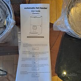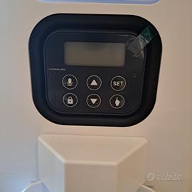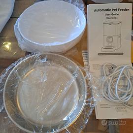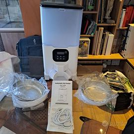 ideale x cani di piccola taglia e gatti. dispenser di cibo secco per 2 animali di piccola taglia, provvisto di 2 ciotole in acciaio con supporto in plastica, programmabile, alimentazione con batterie e presa USB. Programmabile da smartphone.
