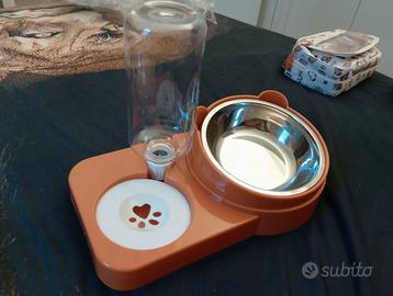 Mai usato, ciotola in acciaio circa 15 cm diametro, distributore acqua circa mezzo litro di capienza e anti-schizzo, design moderno e compatto