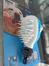 Doccino massaggiante e morbido per lavaggio animali con attacco universale e vano integrato per shampoo. Si può vedere il video dal qr code della confezione. Valore di mercato 12/15 euro. Vendo perché doppio acquisto.