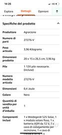 Elettrificatore con pannello solare marca agrarzone 12 volt, 4 ah. Pannello solare 12 volt, 3 watt. Descrizione completa nelle foto, comprato a giugno, praticamente nuovo, vendo per “ purtroppo” inutilizzo.